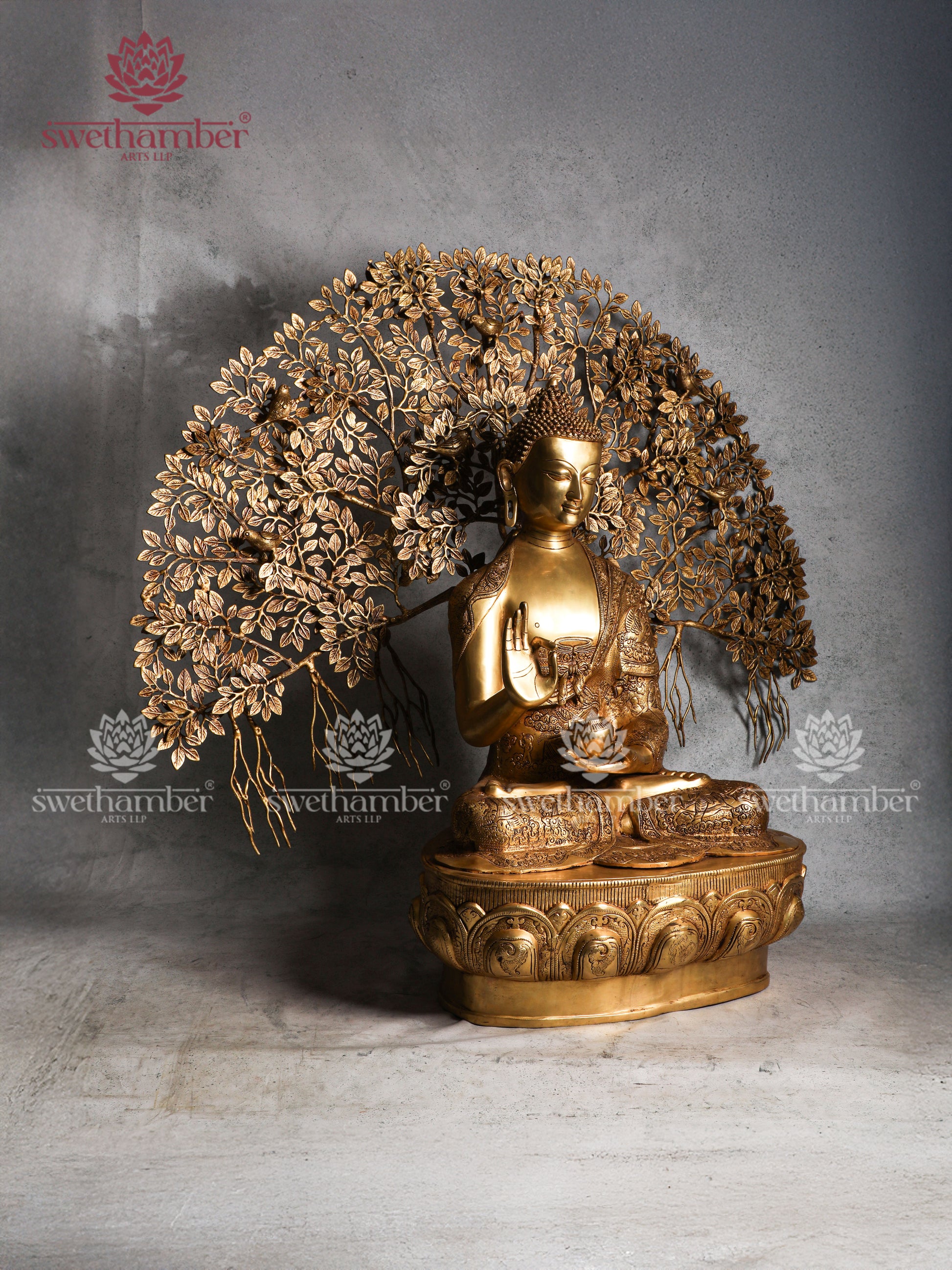 Large Brass Buddha sitting Under Tree