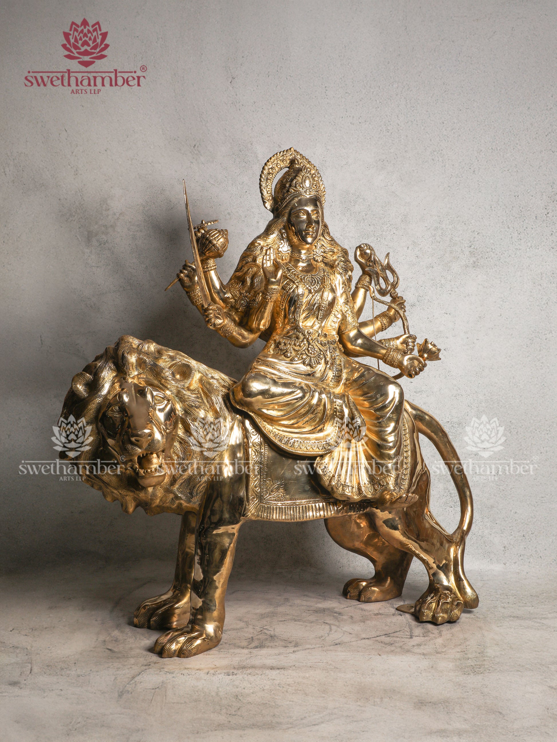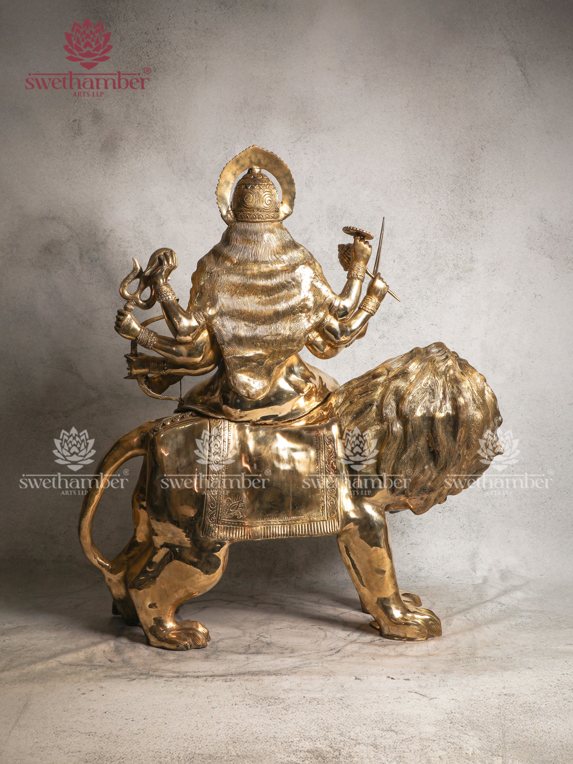 Expertly handcrafted by skilled artisans, the idol showcases intricate detailing, from the goddess’s multiple arms holding her sacred weapons to the lifelike expression of the lion beneath her. Made from premium-quality brass, it exudes a golden shine that enhances the spiritual aura of any space.