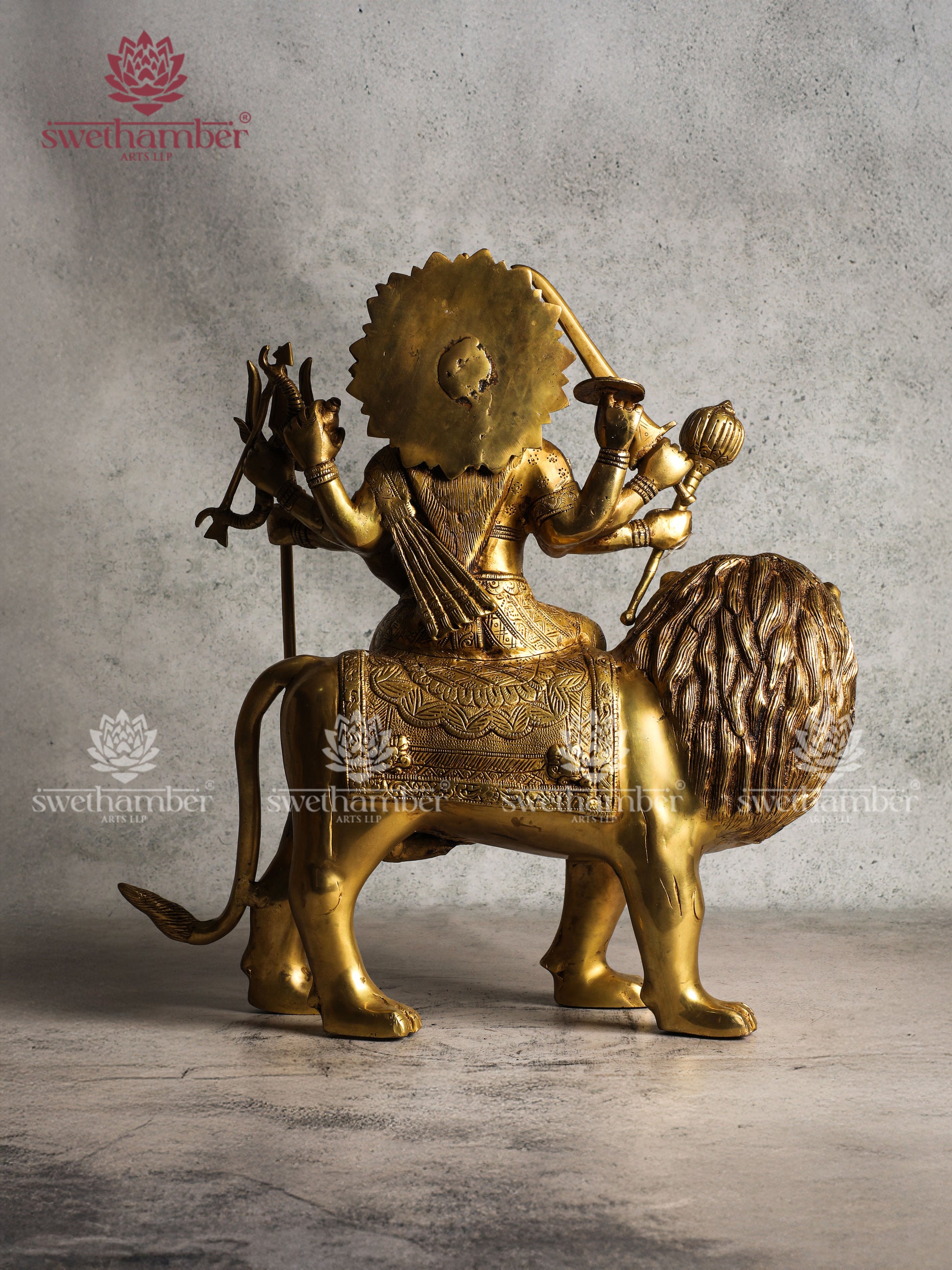 Seated or standing atop a lion or tiger, the Goddess symbolizes fearlessness and control over power. Her multiple arms, gracefully extended, hold sacred weapons and symbols gifted by the gods—each signifying divine attributes such as courage, wisdom, righteousness, and compassion.
