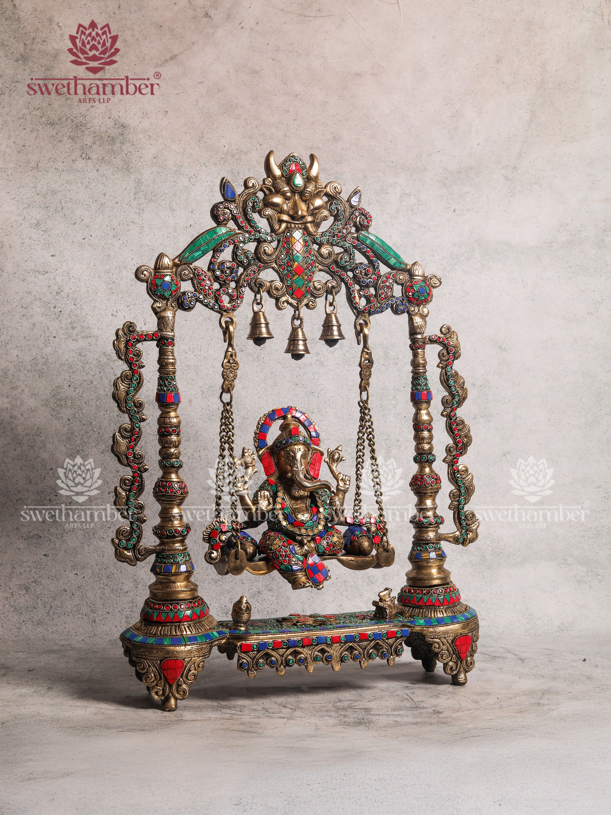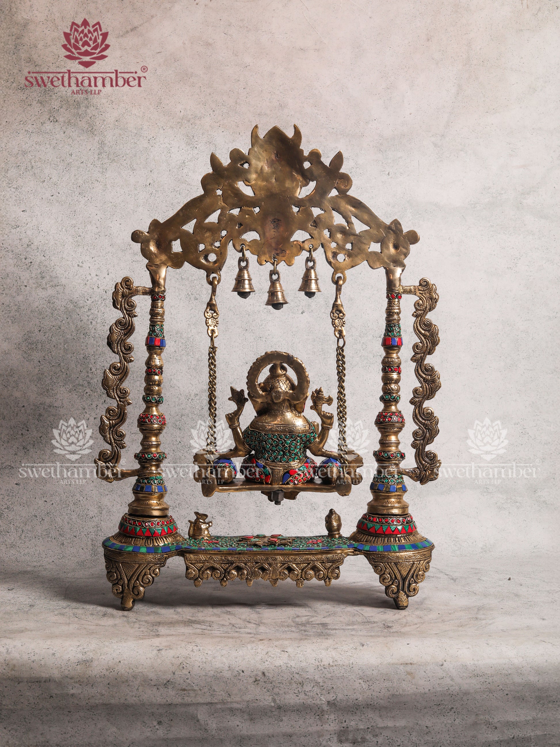 BRASS GANESH ON JHULA SWING WITH COLOURFUL STONES WORK