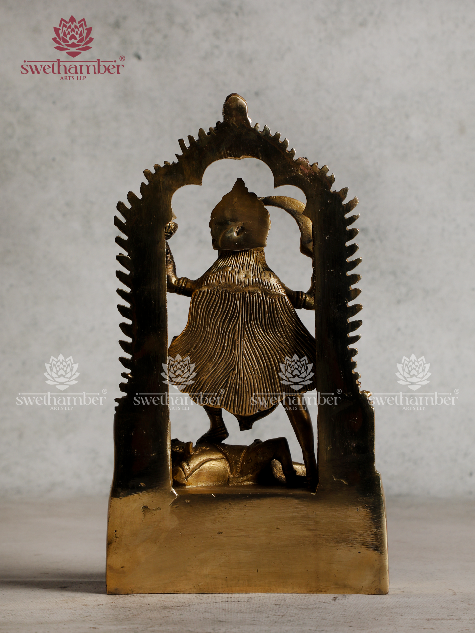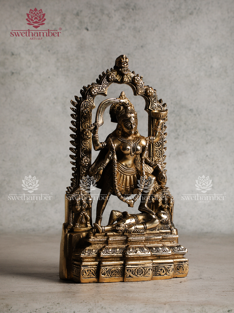 Crafted from pure brass, this stunning Charbhuja (four-armed) Goddess Kali idol showcases intricate detailing and a powerful divine presence. The exquisite craftsmanship captures the fierce yet protective nature of the Goddess, making it a perfect addition to your temple, altar, or home décor.