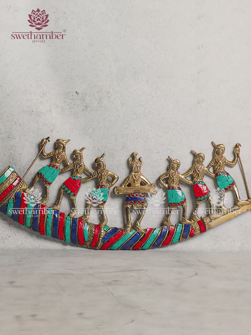 This Tribal Dancing Men on Trumpet Wall Hanging is a striking piece of ethnic art that celebrates tribal culture, music, and dance. Handcrafted from premium quality solid brass, it features beautifully detailed tribal men playing the trumpet in rhythmic dance poses, symbolizing joy, festivity, and cultural heritage.